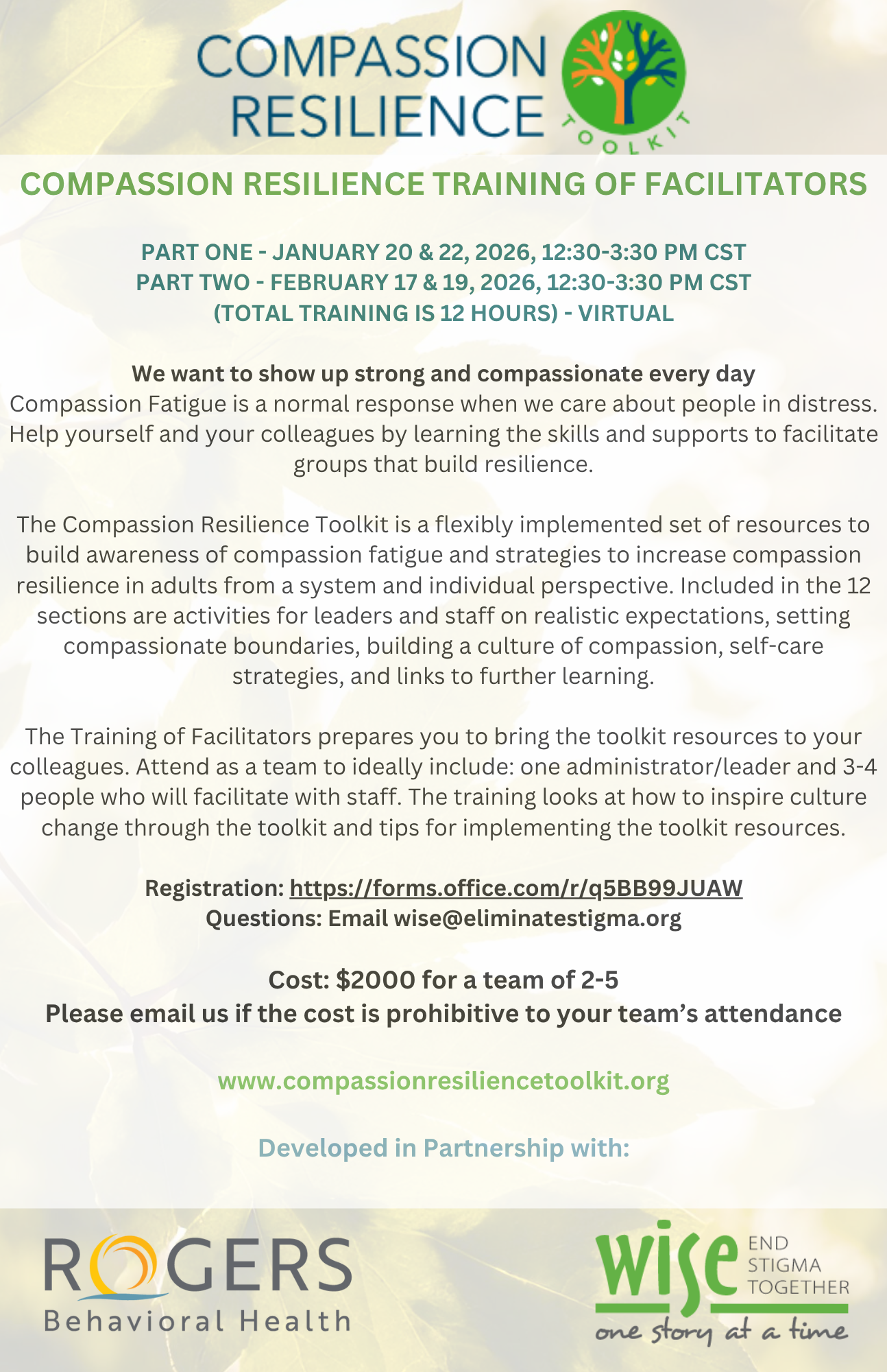 Join us for the Compassion Resilience Training, a toolkit designed to address compassion fatigue and cultivate resilience, hosted virtually from Wisconsin. This resource includes 12 sections covering realistic expectations, setting compassionate boundaries, fostering a compassionate culture, and self-care strategies.