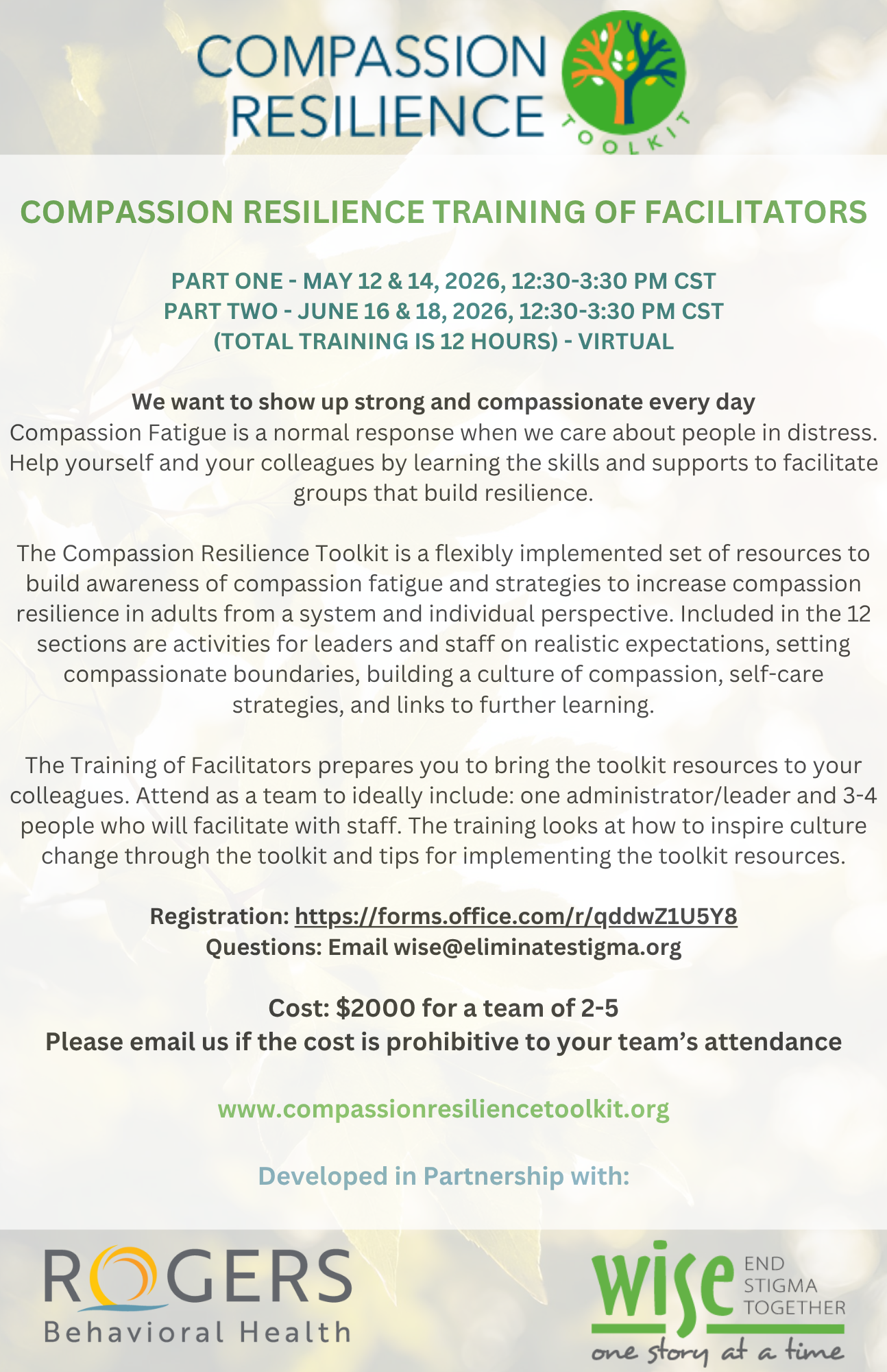 For a team of 2-5 participants, the cost for the two Compassion Resilience trainings is $2,000. This cost ensures that your team receives the comprehensive training necessary to leverage these resources effectively within your organization.