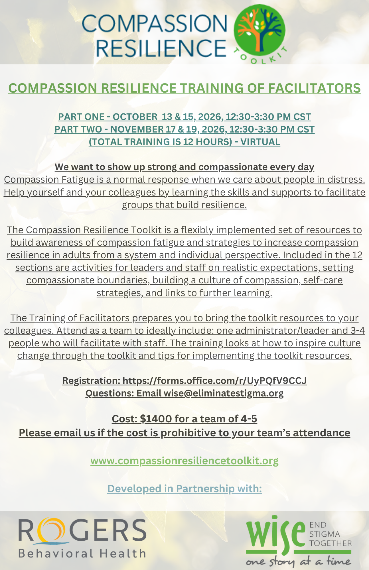 Join us for the Compassion Resilience Training, a toolkit designed to address compassion fatigue and cultivate resilience, hosted virtually from Wisconsin. This resource includes 12 sections covering realistic expectations, setting compassionate boundaries, fostering a compassionate culture, and self-care strategies.